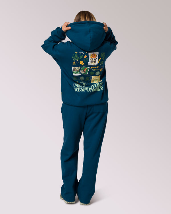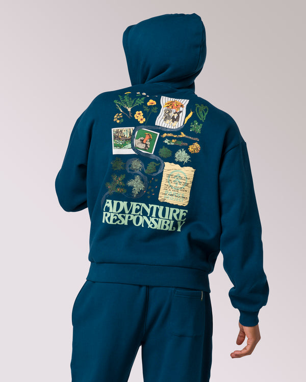 Inspired by a day of responsible foraging—or simply taking in the beauty of the wild around you—this hoodie is designed for those who seek adventure with care. Made for outdoor explorations, it features a relaxed yet structured fit for easy layering, adjustable drawstrings for a secure feel, and an Adventure Responsibly icon on the front as a reminder to tread lightly.