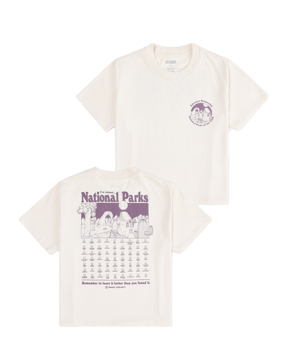 This relaxed-fit, boxy tee features a stylish checklist of all U.S. national parks. Made for comfort and durability, it’s perfect for outdoor enthusiasts. Join our mission to Leave It Better™—supporting and preserving our national parks. Wear it with pride while helping protect these natural treasures for future generations.